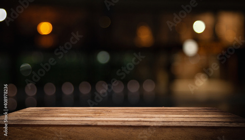 Wooden table top on blurred shop window of cafe with light bulb. Background for product display montage or key visual design.
