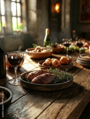wooden, table, variety, food, wine, left, glasses, red, bottle, plate, bowl, filled, different, type, center, right, platter, piece, meat, sprig, rosemary, background, blurred, indoor, setting, window, painting, hanging, wall, atmosphere, cosy, craftsmanship, diversity