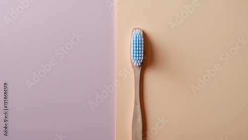 Wooden toothbrush with blue and white bristles positioned vertically against a pastel pink and beige background, emphasizing simplicity and hygiene.