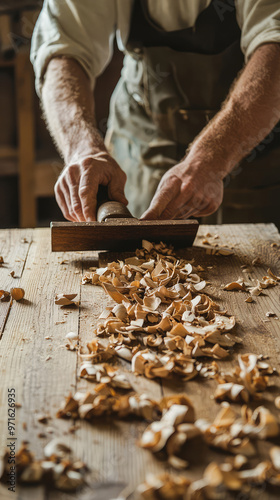 woodworker, smoothing, wood, shaving, craftsmanship, workshop, tool, hand, carpenter's shop, carpenter's shop, artisan, natural light, rustic, detail, surface, skill, wood texture, traditional, hand-made, professional, focused, precision, woodwork, sawdust, workbench