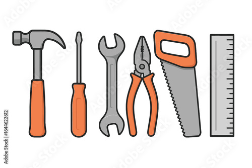 tool, tool, set, construction, repair, work, equipment, vector, icon, illustration, hammer, screwdriver, wrench, plier, saw, ruler, bricolage, carpenter's shop, maintenance, handyman, workshop, industry, building, hardware, instrument, craft, design, element, symbol, graphic, collection, isolated, white, background, flat, orange, spanner, handsaw, measure, object, steel, metal, mechanic, engineer