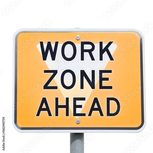 Work Zone Ahead Safety Sign on a Post Warning of Construction and Road Work in the Area