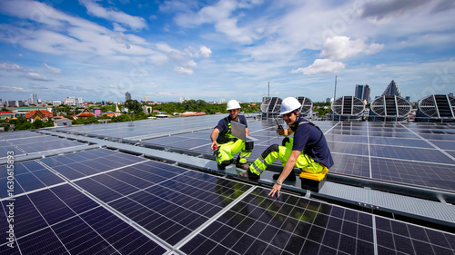 building, city landscape, clean energy, clear sky, construction, environmentally friendly, electrical, energy efficiency, engineering, environmental, equipment, green energy, infrastructure, innovation, installation, labor, maintenance, modern, organisation, outdoors, power generation, productivity, project, renewable energy, rooftop, safety-gear, solar energy, solar panel, sunlight, sustainability, teamwork, technology, tool, urban development, urban setting, men at work, manpower