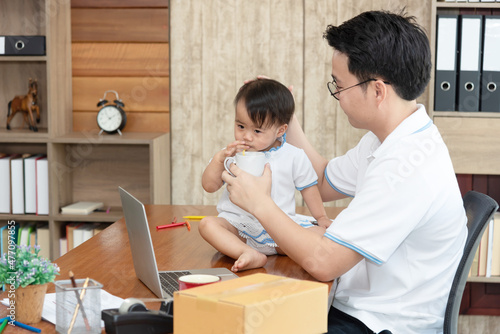 Working businessman busy with work, also taking care of his baby. Multiple tasking Asian father, work from home concept.