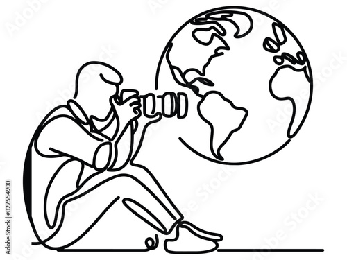 World Photography Day. a photographer with a camera and a one line art hand drawing concept.