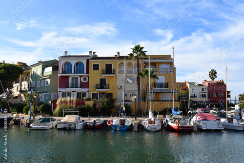 Yachts and motor boats in marina Port Saplaya, Valencia, Alboraya, Spain. Luxury yacht and fishing motorboat in yacht club on background of the colourful houses at Mediterranean Sea. Sailboat port.