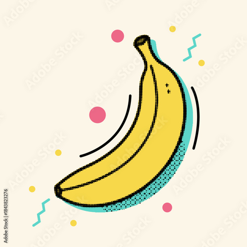 Yellow banana fruit with retro pop art halftone texture and geometric shapes vector illustration