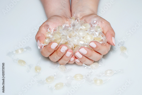 Yellow candy in a transparent wrapper in female hands on a white background