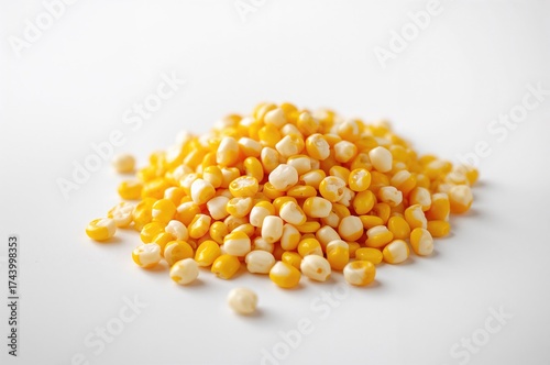 Yellow corn seeds separated on a plain white surface, natural, farm produce, nutrition, agriculture, wholesome meal