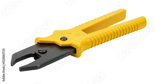 Yellow insulated wire stripper cutting hand tool isolated on a transparent background. Yellow handled crimper tool.