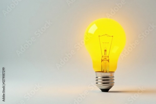 Yellow light bulb in a minimalist setting against a clean white background, light bulb, modern lighting