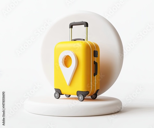 suitcase, yellow, location, pin, travel, journey, trip, baggage, tour tourism, destination, traveler, holiday, vacation, icon, graphic, design, modern, minimal, three-dimensional, illustration, transportation, transport, graphic design, route, planning, packing, travel bag, carry-on, light, white, isolated, minimalism, simple, symbol, worldwide, global