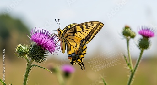 butterfly, insect, yellow, swallowtail, thistle, flower, nature, wildlife, macro, detail, pollination, nectar, summer, meadow, field, garden, flower petals, wing, antennae, leg, biology, ecosystem, beauty, delicate, fragile