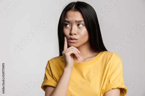 woman, female, girl, person, lady, people, beautiful, pensive, asian, isolated, background, copy space, casual attire, young, idea, contemplative, thoughtful, thinking, question