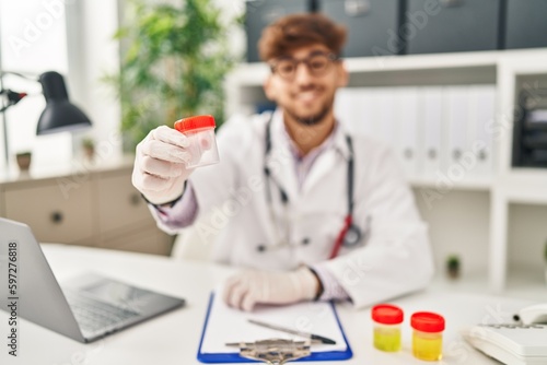 Young arab man wearing doctor uniform holding test tube at clinic