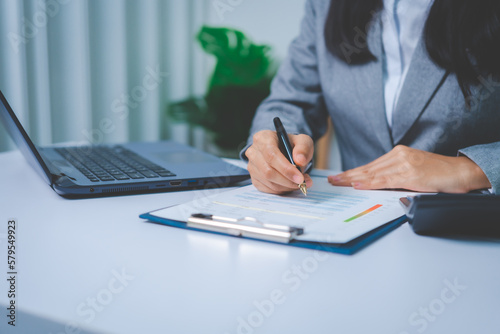Young Asia business woman working with annual summary report and laptop to planner analyze data of balance sheet charts, bookkeepers female people concept. Hold paper clipboard