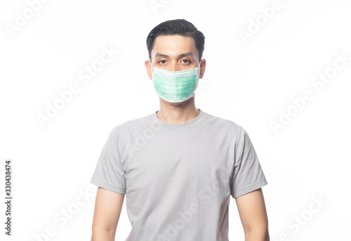 Young Asian Man wearing hygienic mask to prevent infection, 2019-nCoV or coronavirus. Airborne respiratory illness such as pm 2.5 fighting and flu. Studio shot isolated on white background.