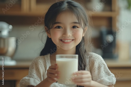 Young Asian woman holding a glass of milk in the kitchen Generative AI