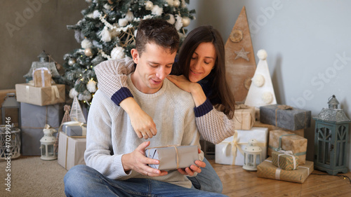 Young beautiful brunette hugging a man holding a Christmas present. Family tradition. Gift exchange.
