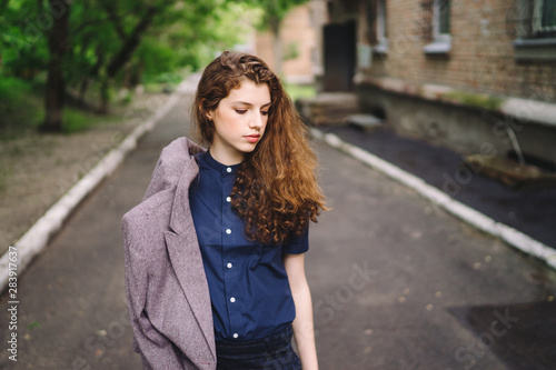 Young beautiful caucasian woman walking in old town. Female art portrait. Stylish girl with long curly red hair.