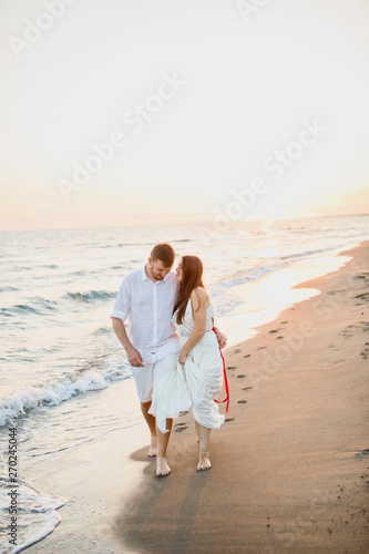 young beautiful couple in white clothes walking on the beach near the sea at sunset