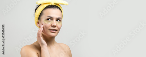 Young beautiful girl in a white towel on his head wears collagen gel patches under her eyes. Mask under eyes treatment face.