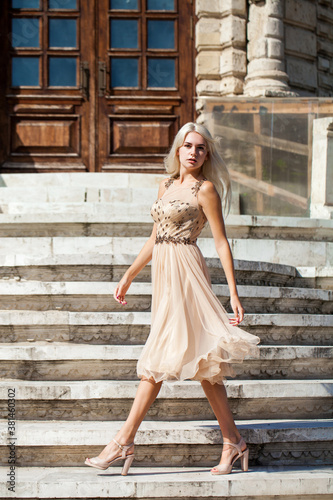 walking, going, full body, 1, model, beauty, fashion, girl, person, hair, female, elegant, lady, pretty, happy, glamour, luxury, sensual, sexy, clothes, caucasian, portrait, adult, attractive, lifestyle, background, street, outside, shoe, vogue, stylish, lush, foot, summer, young, beautiful, blond, beige, dress, stone, step, facades, leg, gown, woman, calm, sunny day, door