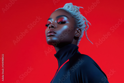 woman, black, white, hair, red, background, studio, portrait, fashion, beauty, make-up, activewear, posing, model, style, trendy, contemporary, vibrant, colours, confidence, attitude, individuality, expression, female, young, adult, african, american, coiffure, cosmetic, clothing, apparel, activewear, shot, photo, portraiture, intense, bold, powerful, modern, stylish, cool, edgy, chic, glamour, elegant