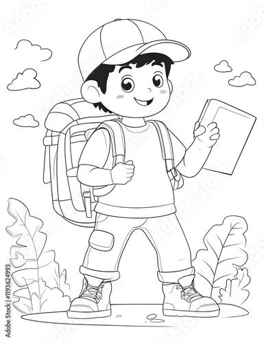 boy, hiking, backpack, adventure, book, nature, illustration, cartoon, children, exploration, travel, walk, journey, path, forest, wood, tree, leaf, plant, landscape, scenic, summer, spring, happy, cheerful, smiling, cap, hat, shoe, boot, pant, shirt, clothing, drawing, vignetting, line art, black-and-white, children