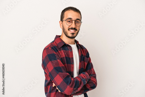 Young caucasian man isolated on white background happy, smiling and cheerful.