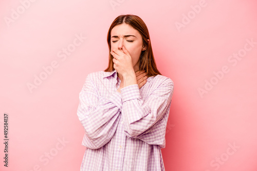 Young caucasian woman isolated on pink background suffers pain in throat due a virus or infection.