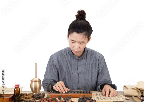 china, medicals, medicine, drug, medicine, herbal medicine, chinese, asian, oriental, young, young people, female, white background, indoor, pharmacy, prescription, costume, abacus, tradition, element, culture, training, learning, internship, inheritance, development, essence, industry, occupation, preparation, taking medicine, rescue, treatment
