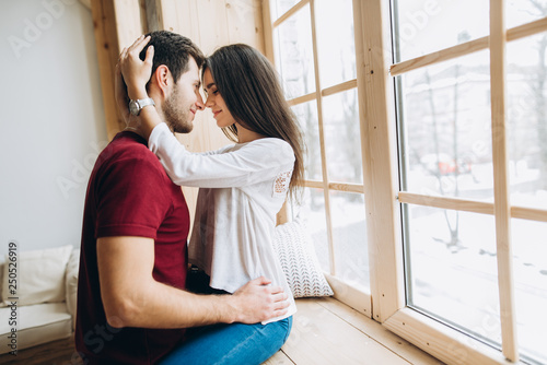 Young couple in love hugging near the window in their cozy modern home. They are happy spending time together