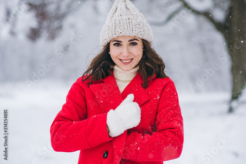 Young girl in a red coat walking in a snow-covered park. Christmas is comming. New Year.