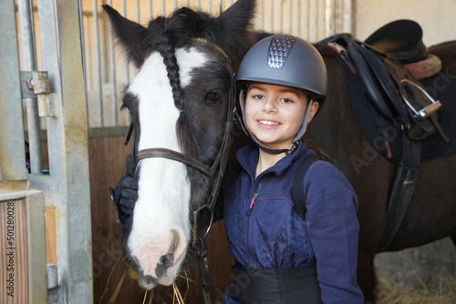 young girl preparing her horse in a stable