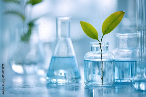 Young green plant sprout growing in laboratory glassware with blue liquid.