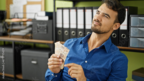 Young hispanic man business worker counting mexican pesos banknotes at office