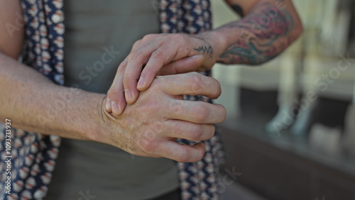 man, hispanic, pain, hand, street, city, injury, young, outdoors, adult, discomfort, urban, distress, painfully, male, trouble, emergency, bruised, casual attire, attire, tattoo, real, people, wounded, health, care, medicals, aid, sidewalk, public, crisis, assistance, suffering, worried, individual, mature, physical, painful, problem, help, urgent, serious, issue, daily, struggle, health care, accident, adult