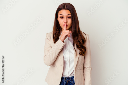 Young Indian business woman isolated on white background keeping a secret or asking for silence.