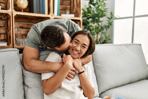 Young latin couple sitting on the sofa hugging at home.