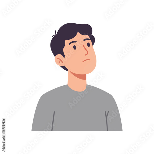young man is looking up with a puzzled expression