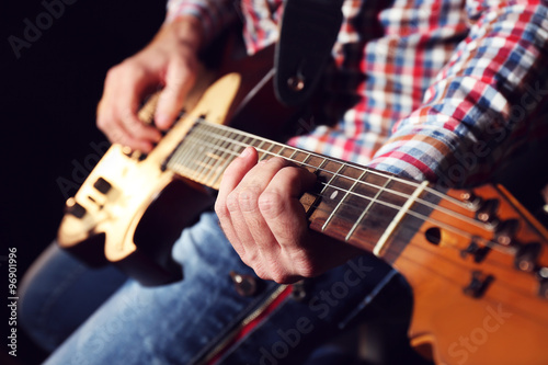 Young man playing on electric guitar close up