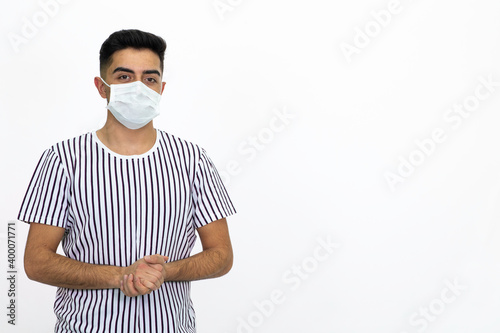 Young man wearing a white striped shirt. He's wearing a medical mask. He has a cell phone. White background. Isolated image.