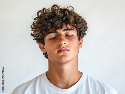 young, man, curly, hair, meditation, mindfulness, relaxation, peaceful, contemplation, youth, calm, serene, portrait, closed, eye, simplicity, calmness, mental, wellness, personal, growth, breathing, sharpened, solitude, inner, peace, harmony, expressive, skin, teenage, lifestyle, emotion, body, language, smile, thoughtful, positive, energy, expression, stillness, quietness, natural, light, casual attire, attire, harmonious, practice, zen