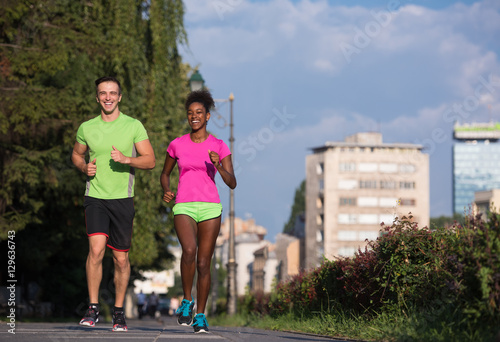 young smiling multiethnic couple jogging in the city