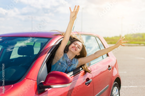 Young woman in car. Girl driving a car. Smiling young woman sitting in red car
