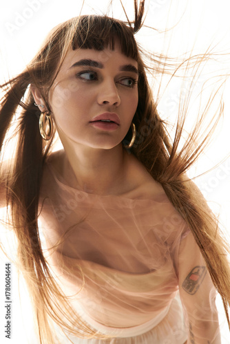 woman, young, beautiful, stylish, fashion, hair, portrait, elegance, pose, confidence, model, beauty, serene, light, attractive, expression, texture, trend, chic, outfit, grace, colours, coiffure, accessory, earring, emotion, femininity, personality, creativity, soft, visual, captivating, feature, style, movement, runway, allure, classic, aesthetic, character, natural, essence, key, bliss