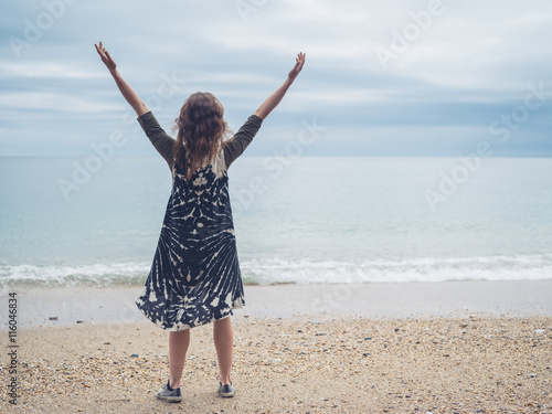 arm, beach, coast, faith, god, meditation, summer, adult, beautiful, beauty, contemplate, day, female, happiness, happy, health, hope, joy, nature, outdoors, outside, pebble, person, raised, religion, sand, shore, shoreline, spring, thinking, thought, travel, woman, young