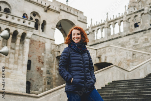 Young woman with ginger hair in the Fisherman's Bastion in the Castle district of Budapest