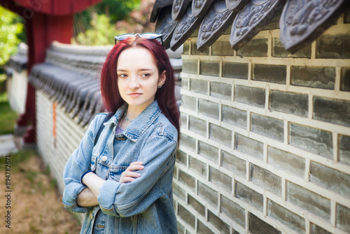 Young woman with red hair and freckles in jean jacket smile and lean against korean wall